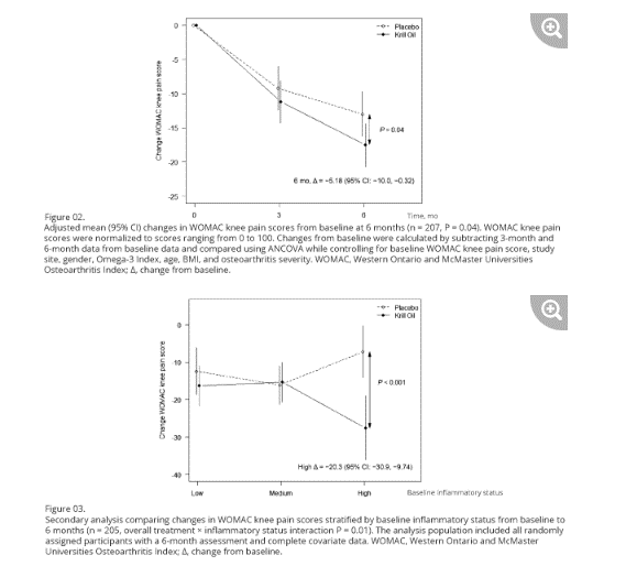 Stonehouse W.; Benassi-Evans B.; Bednarz J.; et al. Krill oil improved osteoarthritic knee pain in adults with mild to moderate knee osteoarthritis: a 6-month multicenter, randomized, double-blind, placebo-controlled trial. The American Journal of Clinical Nutrition, Volume 116, Issue 3, September 2022, Pages 672–685.
